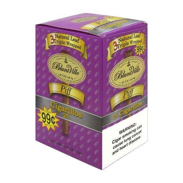 The cigars in the Bluntville Triple Wrapped Piff line are manufactured in Nicaragua using a machine. These light-to-medium cigars have three leaf wrappers that may be removed or left on to adjust the smoking experience. Cigars made from natural tobacco are packaged in foil so they stay fresh longer. Each box of contains 25 cigars.